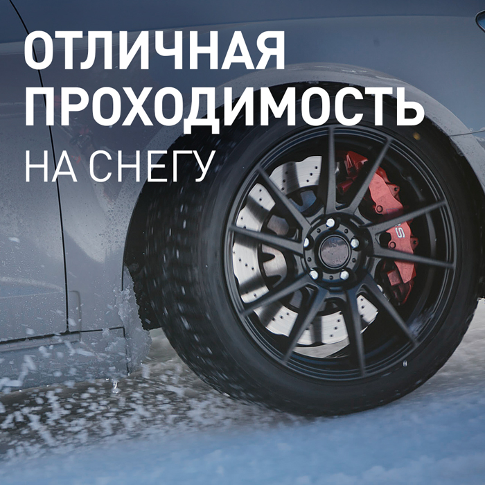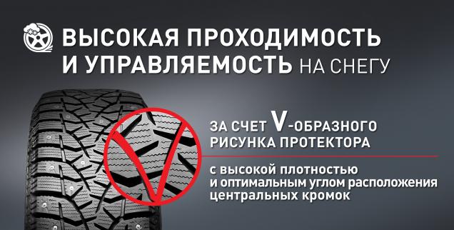 Благодаря особенному V-образному рисунку протектора с высокой плотностью и оптимальным углом расположения центральных кромок увеличивается проходимость в глубоком снегу.
