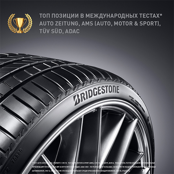 Победитель и призер международных тестов Auto Zeitung, AMS (AUTO, MOTOR &SPORT), TÜV SÜD и ADAC (№1 в 2019 г. и №2 в 2020 годах, №2 и №3 в 2022 г.). Turanza T005 продемонстрировала высокие показатели торможения и управляемости на мокром и сухом покрытии.1